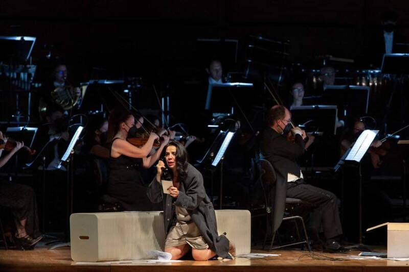 Sur l'invitation du maestro Giuseppe Grazioli, Louise Brun propose une mise en espace "semplice ed elegante" (C. Guzzardella pour Corrierebit) de l'oeuvre de Poulenc. En utilisant l'espace étroit d'avant-scène comme un couloir au sens propre, "elle", noyée dans une mare de lettres, de cartes, de photos, d'ordonnances... de débris de son histoire, cherche à les rassembler dans un petit carton de déménagement. Le seul mobilier, un banc de papier, fait écho à la matière inconsistante de ses souvenirs, et manifeste la précarité de ce départ déchirant.